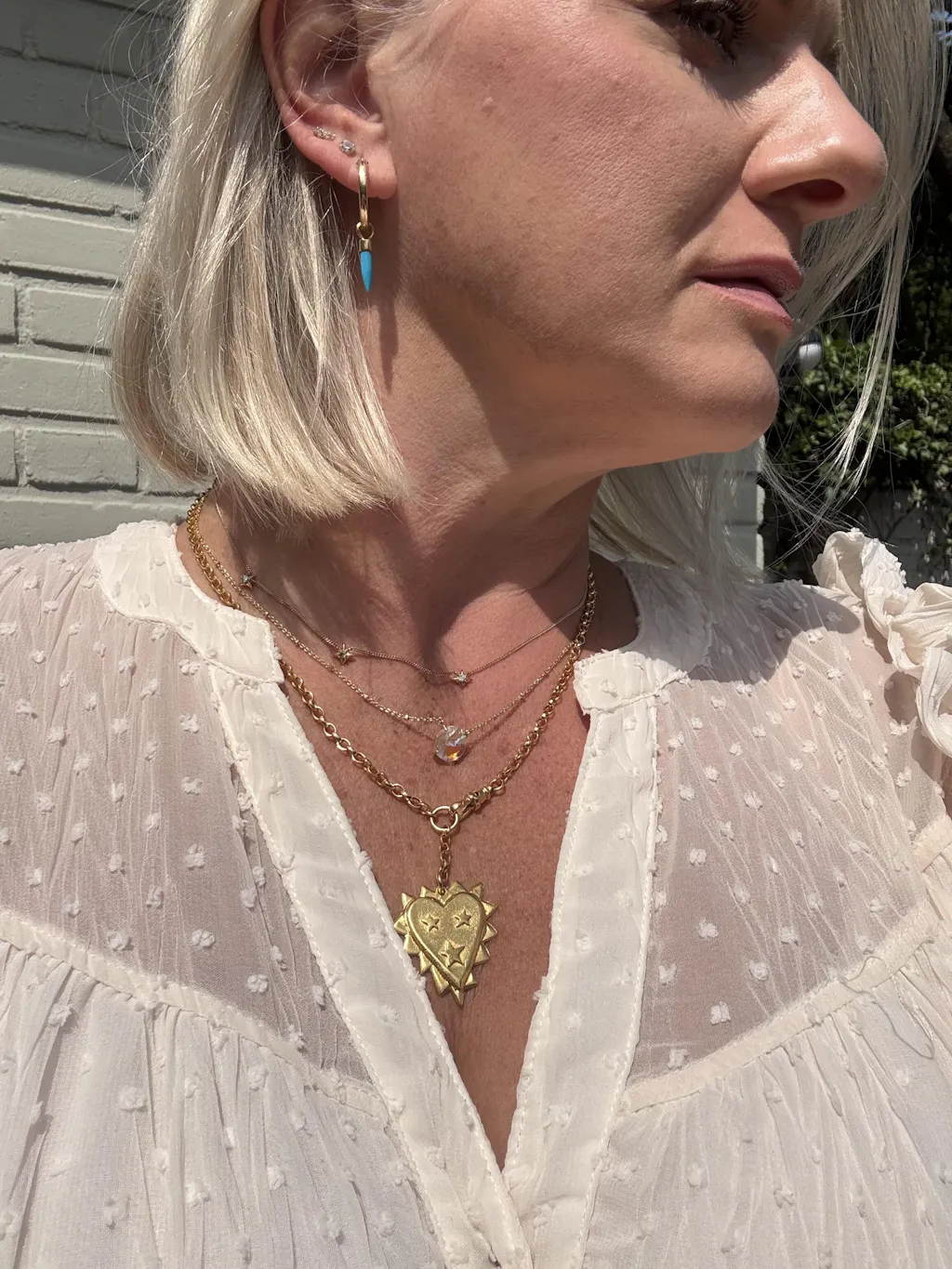 The jagged heart pendant features a front Albert clasp with a drop detail, creating a strong focal point, while an additional clasp at the back allows the necklace to be worn at multiple lengths for versatile styling.