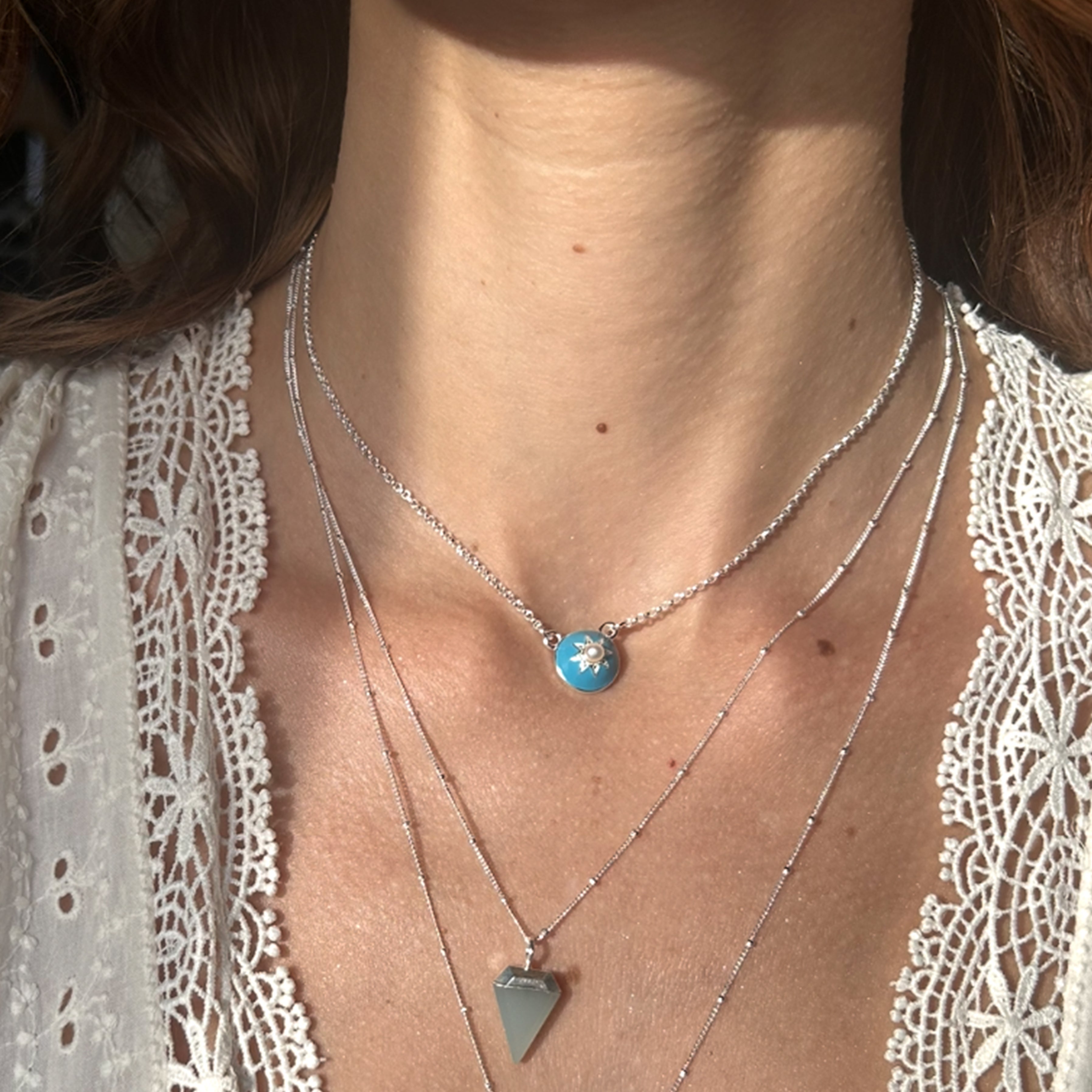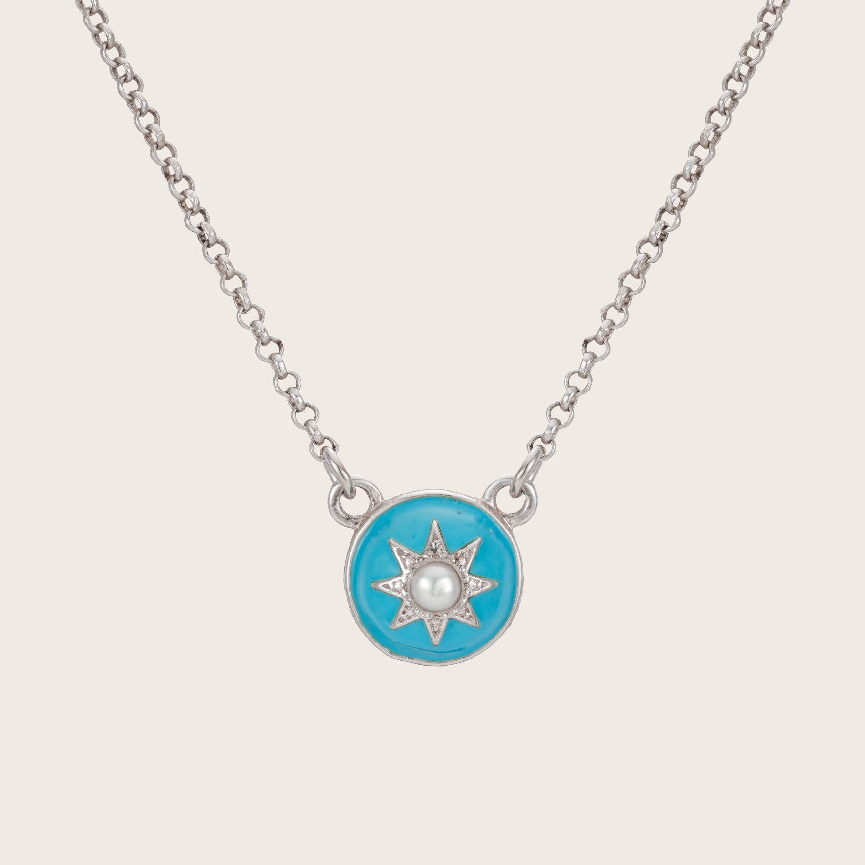 We love this quote which has inspired us for the North Star collection, each piece has been hand enamelled with a pearl in the middle of a star in the centre. This a delicate and beautiful short necklace of 16" which can be extended to 18"